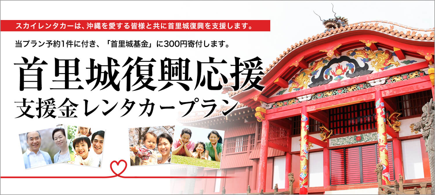 私達 沖縄地区に本拠地を置くスカイレンタリース株式会社では、「首里城再建」を強く願い、以下の支援プランを実施し、当プランご予約1件につき300円を寄付させて頂きます。